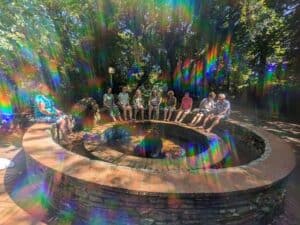 - DAG 4: Rust. Maar tien minuten van onze slaapplek liggen allerlei torens, en een ervan is heel bijzonder, groot, en je kunt je voorstellen dat het hemel-aarde-licht-torens zijn. Kosmische verbinding, kosmische mens. Eromheen schitterende bomen, allemaal nauwelijks bezocht… Weer zo’n plek waar we van alles idyllisch kunnen doen, dansen, rusten, geen haast, we zijn ook zo weer thuis. Een wandelingetje verderop zijn barretjes. De andere kant uit lopen pittoreske paadjes de natuur in. Als je voor het donker maar thuis bent 🙂